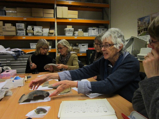 Museum Society members examine pottery in the Roman Baths storeA small party of Museum Society members was treated to a tour of the stores of the Roman Baths Museum in Bath. The serious reason for the trip underground in Bath was towards identifying and understanding the Roman and Medieval pottery that has been found in Budbury and other places in Bradford. They had the opportunity to examine some fascinating sherds from the material that was excavated when the Temple courtyard was exposed in the 1980s and at the old Hat & Feather at the top of Walcot Street. As so often, much was learnt from some articles, while others were new and confusing. It always seems that much more work has to be done before we can sure about where the Bradford pottery has come from.