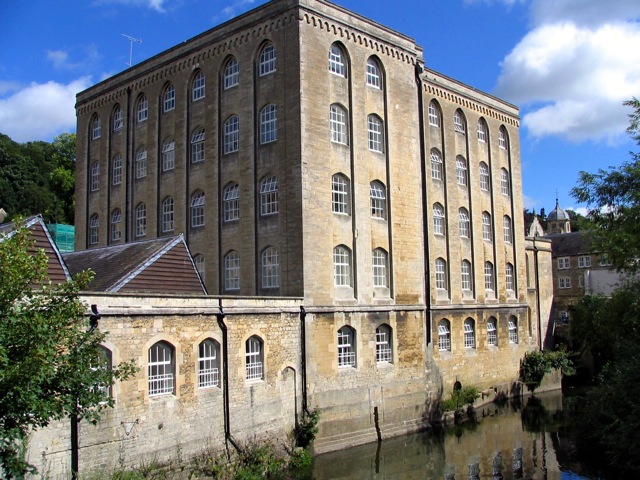Abbey MillThe present Abbey Mill was the last great woollen cloth factory to be built in Wiltshire. It consists of a square block with a narrower wing at right angles on the western side, all of 5 storeys. What you see now is largely a building of 1875, designed by Richard Gane of Trowbridge. It replaced an older building which is represented by the cross-wing. Cloth production ceased in 1902, changing to the Spencer Moulton rubber works after occupation by Australian soldiers in the Great War. The Avon rubber company converted it into offices and restaurant in 1972. After Avon left, it and Church Street Mill were converted into retirement apartments in 1997.